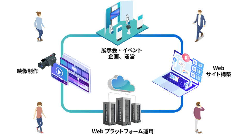現状分析から戦略立案、施策の検討と実施、運用、改善まで、お客様のご要望に対応。 Webから展示会やイベント、映像や配信など、さまざまなサービスを提供しています。